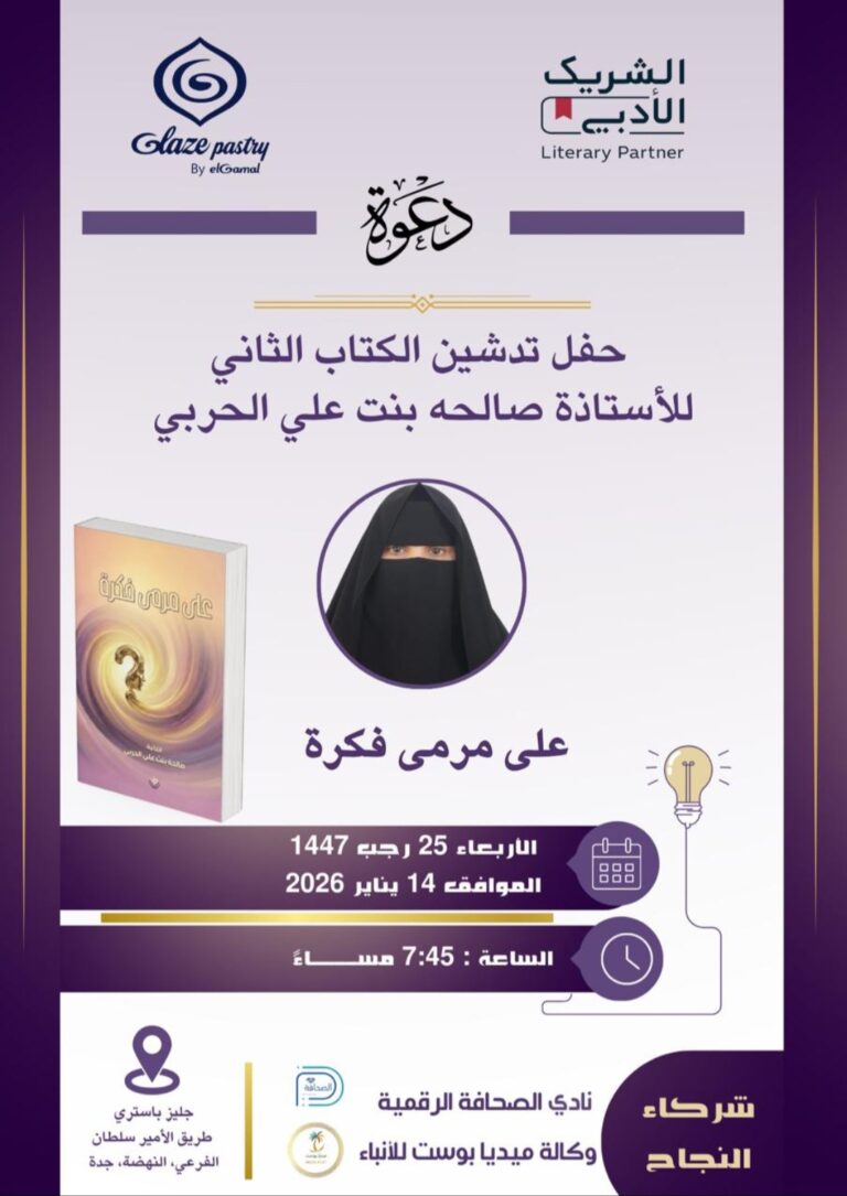 تستعد الأوساط الأدبية والثقافية في جدة لحضور حدث مهم، حيث سيتم تدشين الكتاب الثاني للأستاذة صالحه بنت علي الحربي، بعنوان “على مرمى فكرة”، يوم الأربعاء 25 رجب 1447 الموافق 14 يناير 2026، في تمام الساعة 7:45 مساءً، بمكان جليز باستري، طريق الأمير سلطان، الفرعي، النهضة، ومن ضمن “أنشطة الشريك الأدبي” التي تعزز الحراك الثقافي في المملكة العربية السعودية، وفي ظل رؤية المملكة 2030.